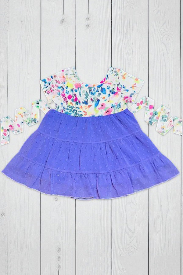 Dress features floral print w/purple swirl skirt & short sleeve cut.