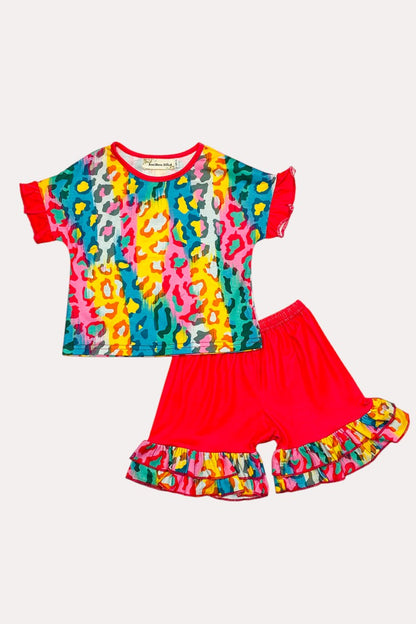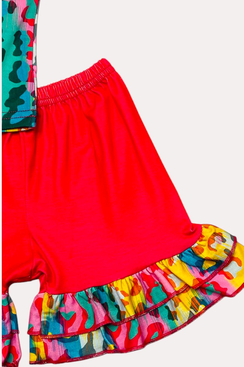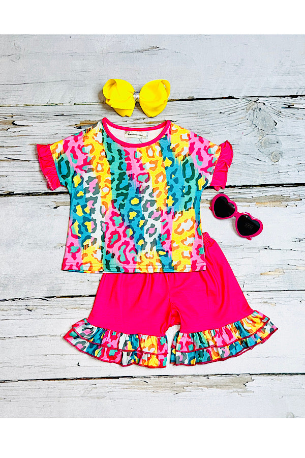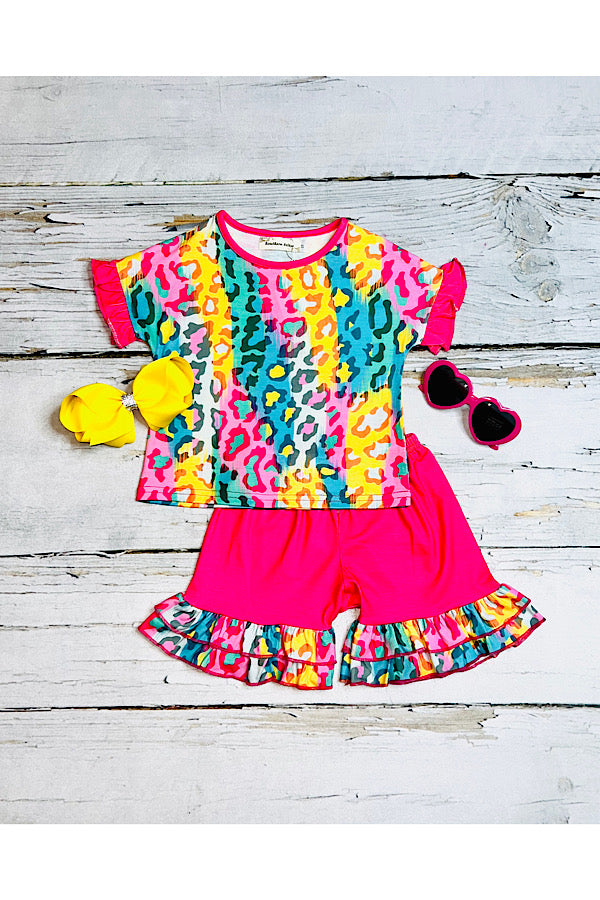 - Shorts with hot-pink and ruffle match with the top.