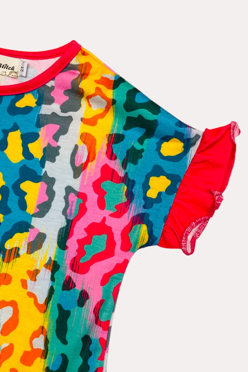 - Top features an leopard print on a colorful background.