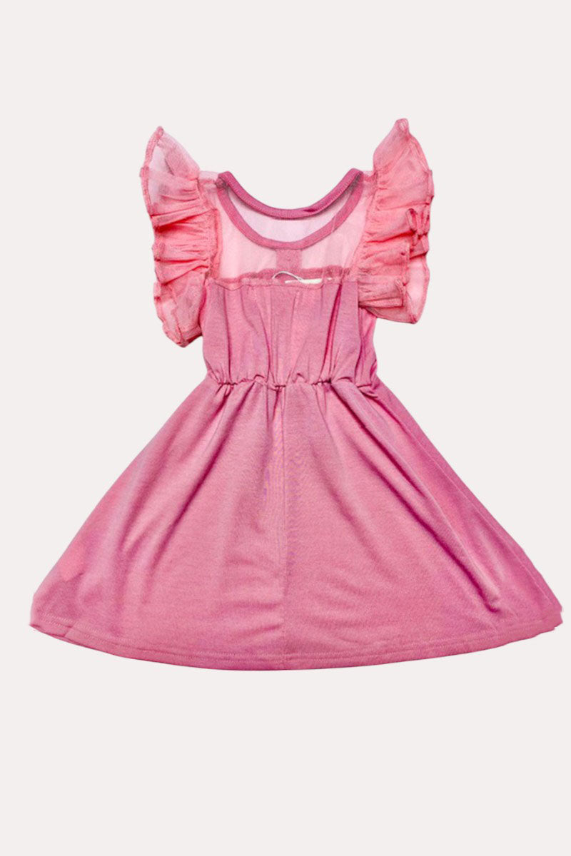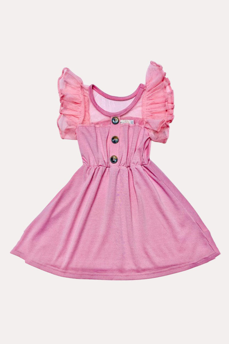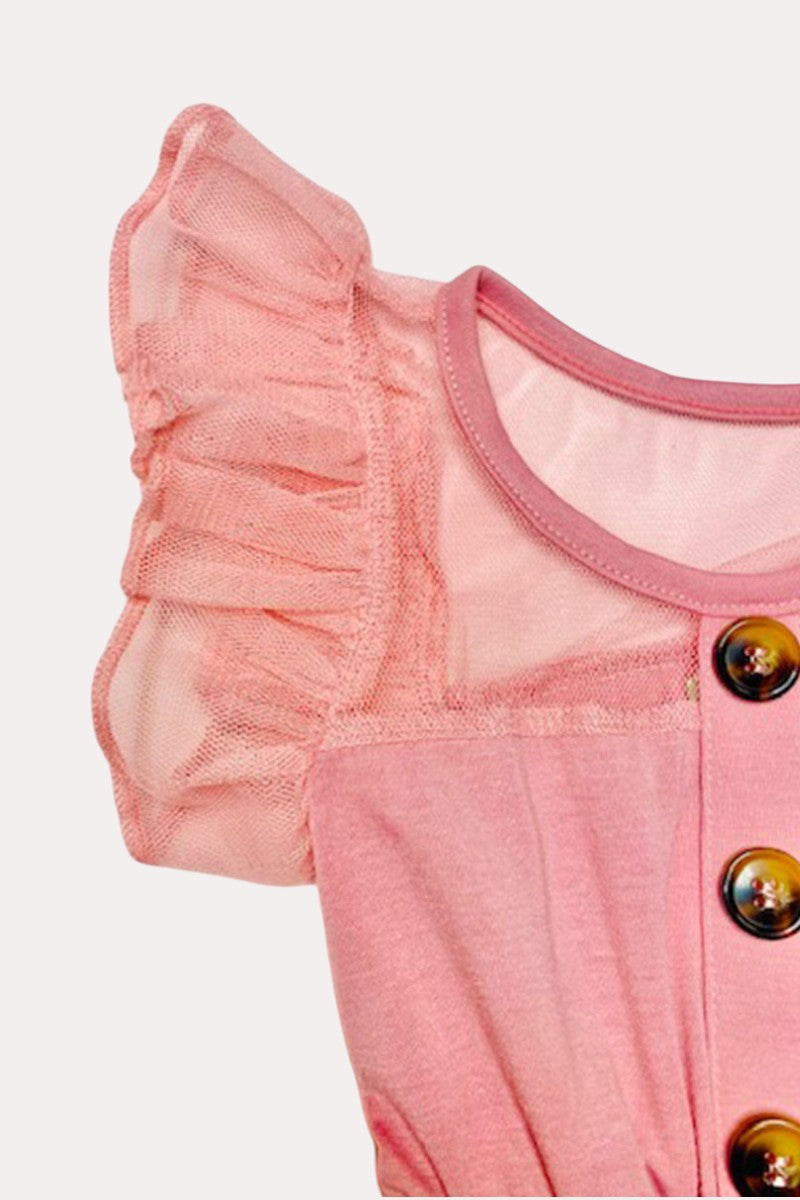 - Dress features solid rose pink color w/pink tulle ruffle short sleeves & buttons on going down on chest line.