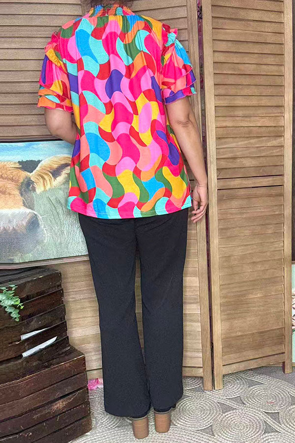 Top features with multi color patterns printed with mock neck and ruffle cap sleeves.
