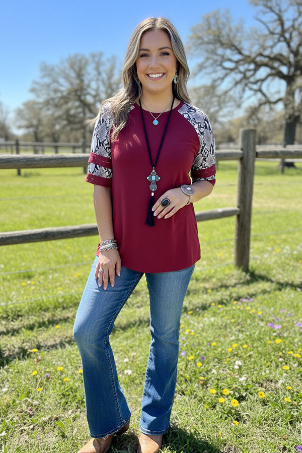 Rust red & snake printed raglan short sleeve women tops GJQ15602