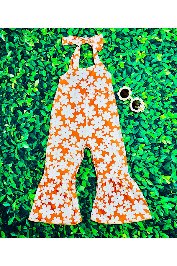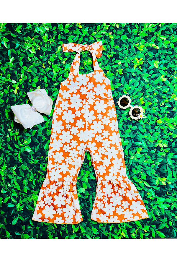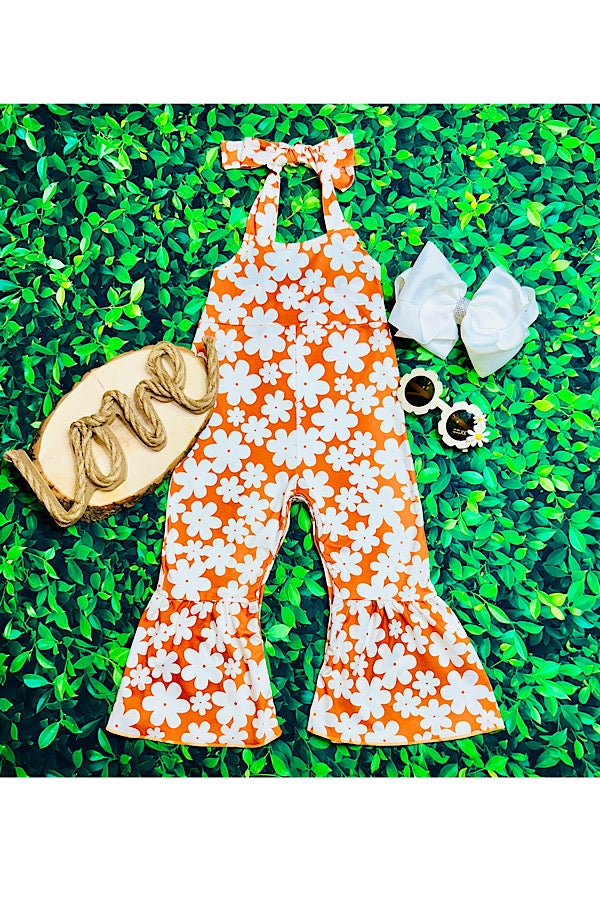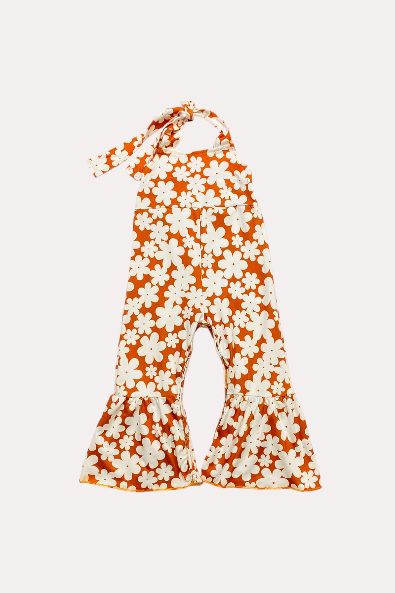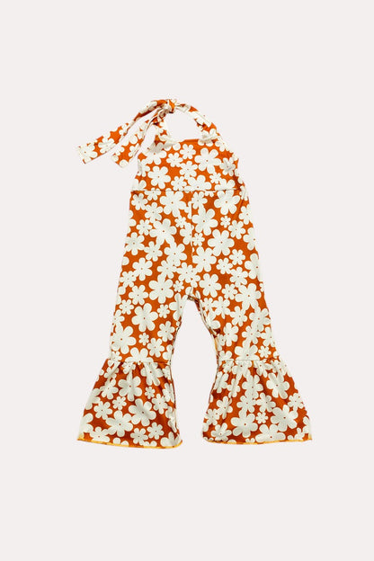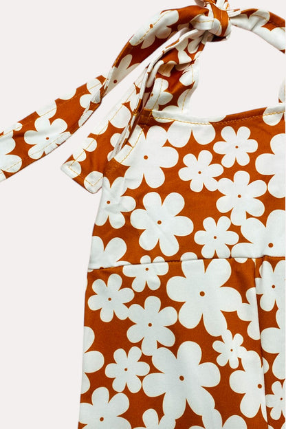 - Jumpsuit features white floral print on rust background w/open back halter cut.