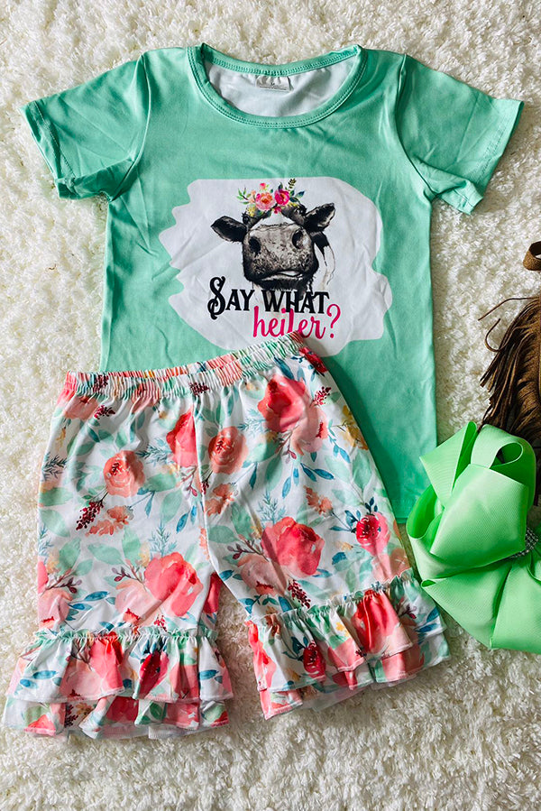 - Wholesale kids wear-Top features "SAY WHAT HEIFER?" wording & cow face logo on mint green background & short sleeve cut.