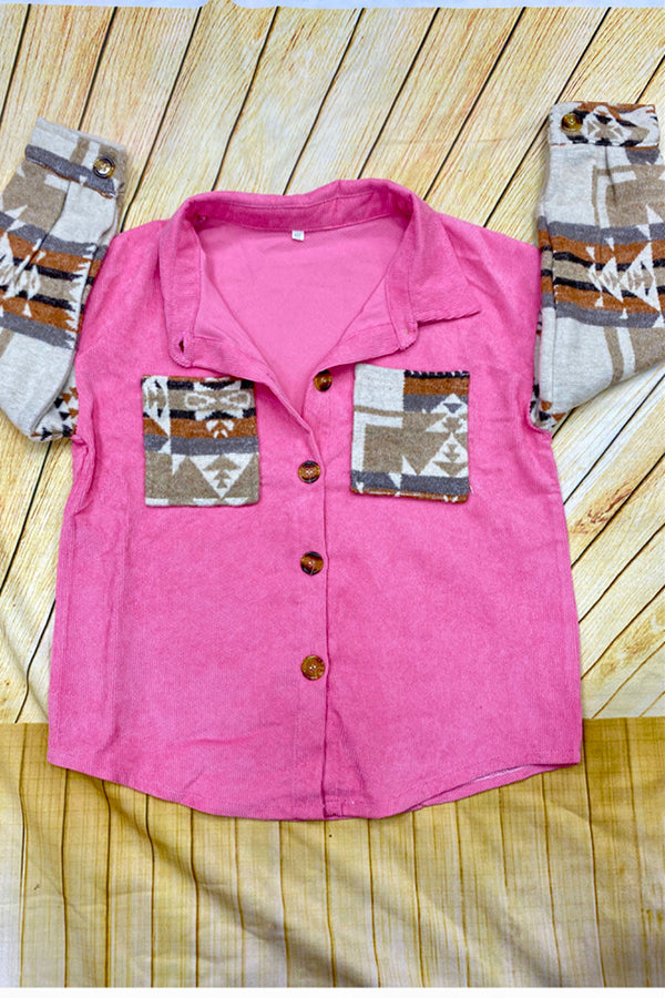 - The top features serape long sleeve with pink background.