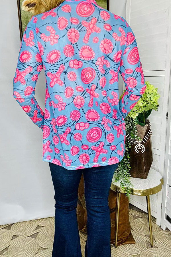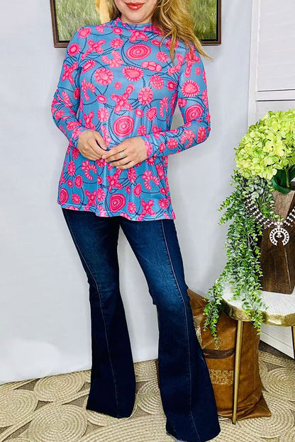 Top features with western jewel printed with long sleeves & sheer mesh fabric & wholesale price.