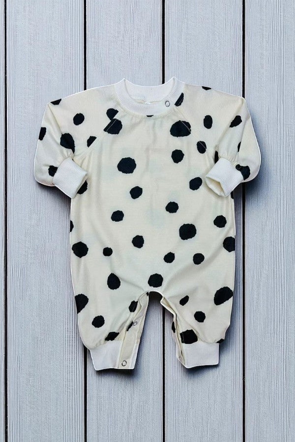 Romper features with cream white dots & raglan long sleeves, shoulder & bottom with snap buttons.