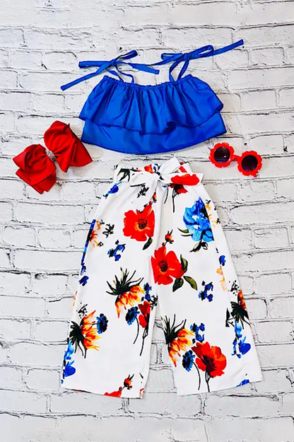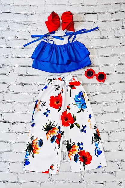 Bottoms features blue, red & orange floral print on white background w/flare legs & belt.