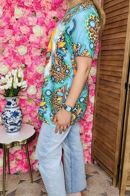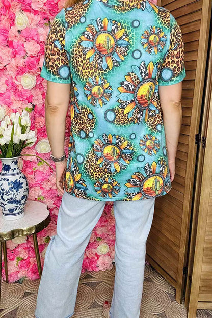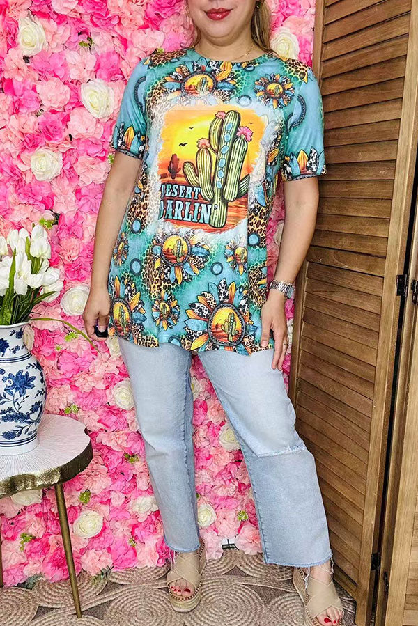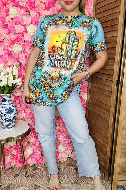 Top features with DESERT DARLIN & cactus & sunflower & leopard western printed with short sleeves.