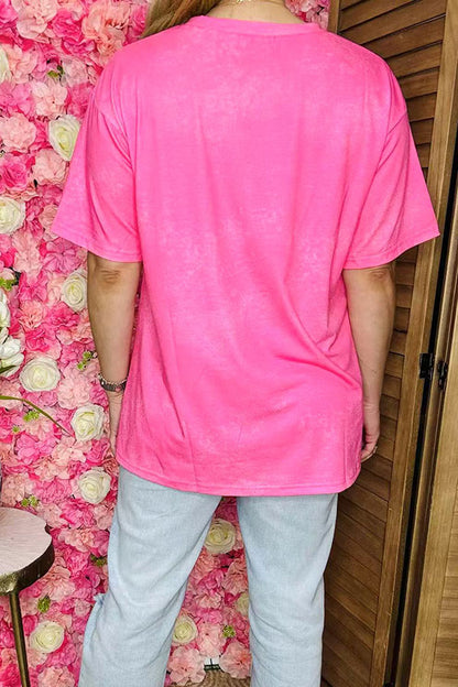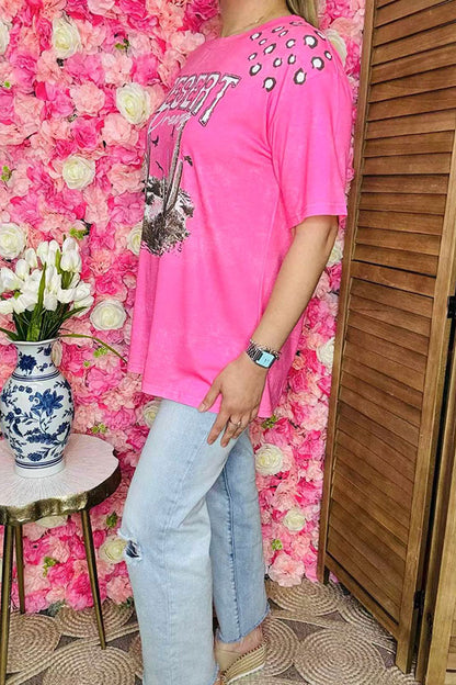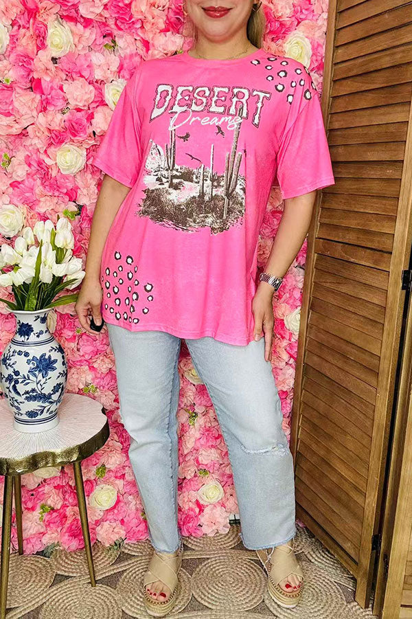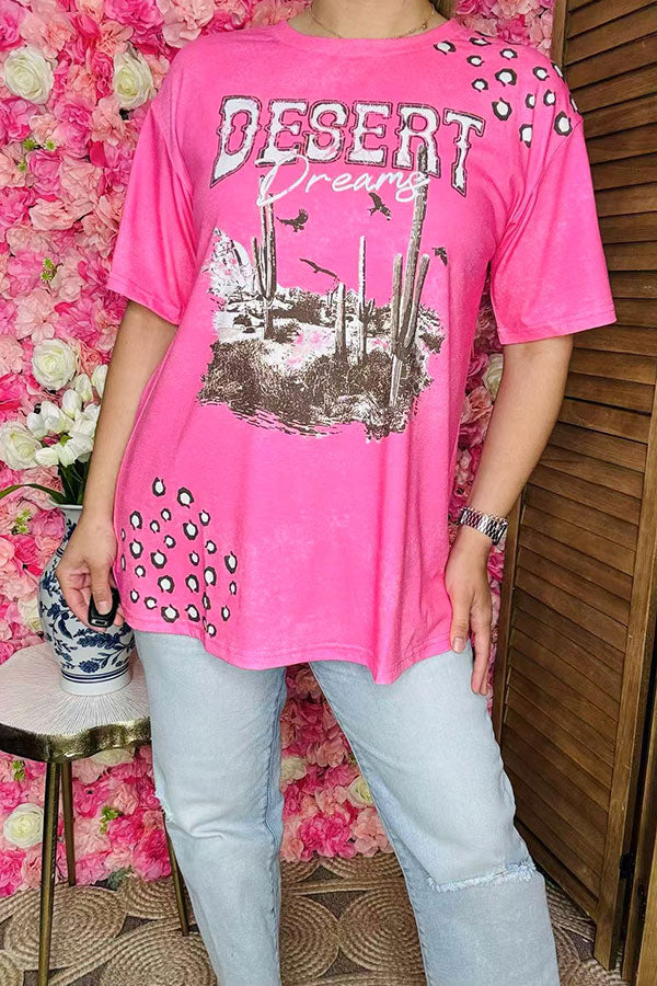Top features with DESERT dreams printed on pink background with short sleeves.