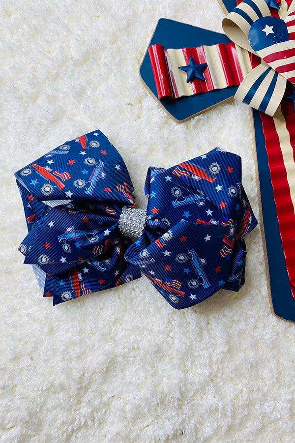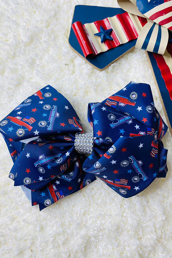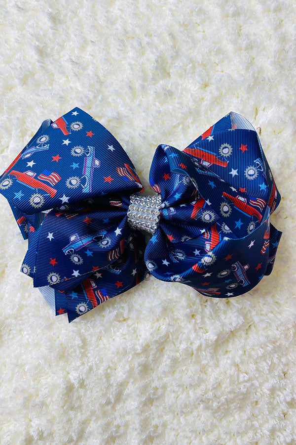 Bule flag & cars printed double layer hair bows 7.5" with rhinestones(4PCS/$10.00)
