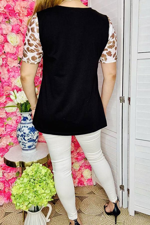 Top features Black/white plaid leopard short sleeve black color body raglan women tops