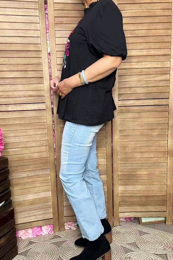 Top features with mutli color floral embroidery at front with black puff short sleeves.