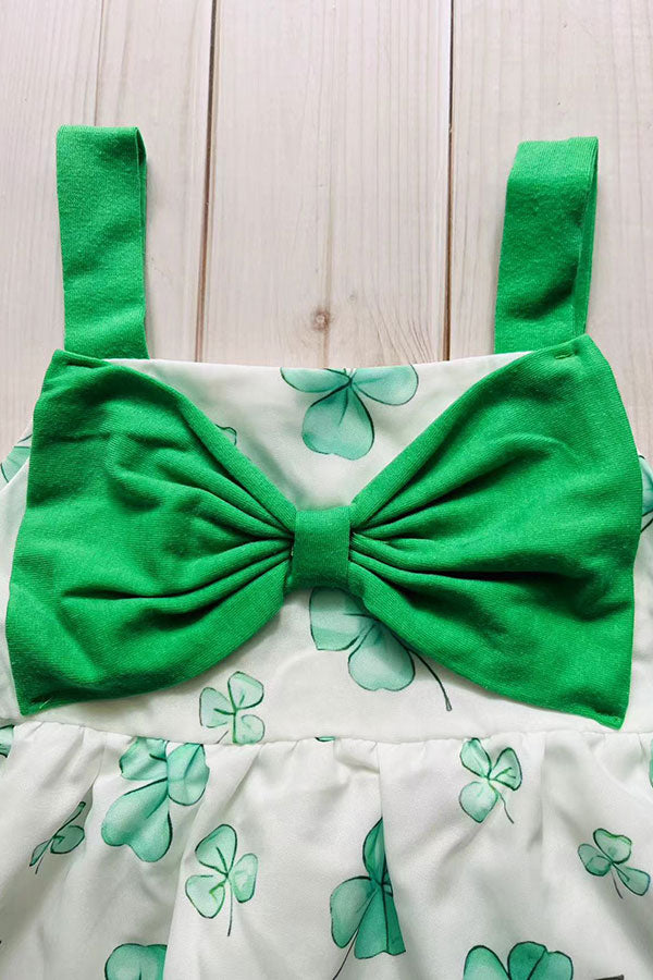Dress feathres with four-leaf cloverprinted with green bows.