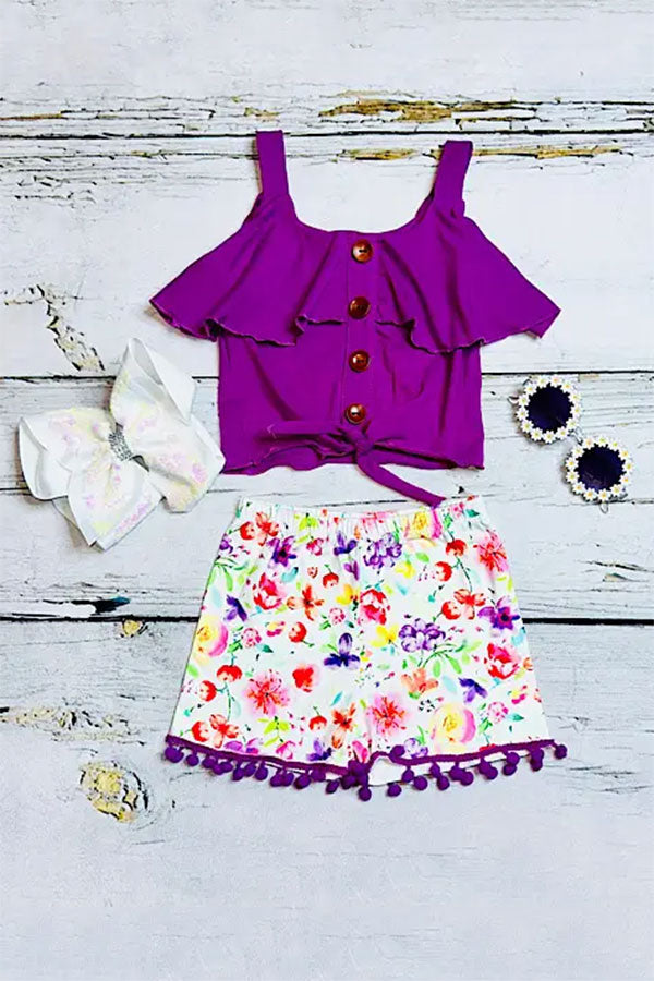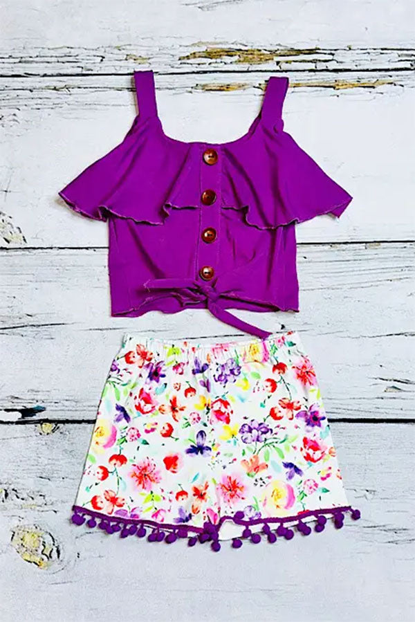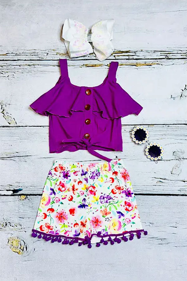 Shorts feature multi color floral print w/purple pompoms on legs.