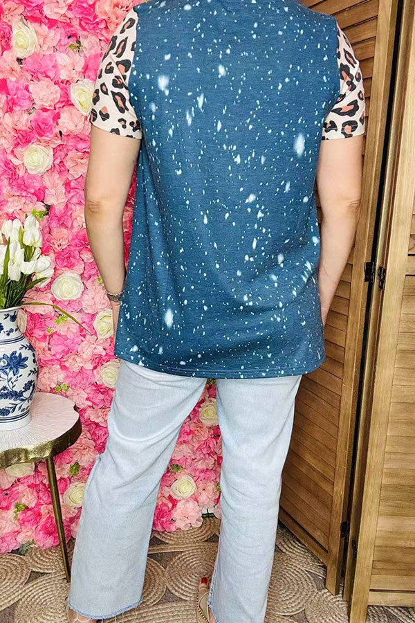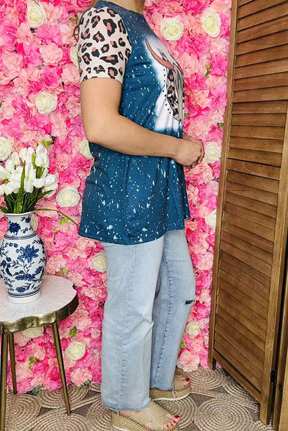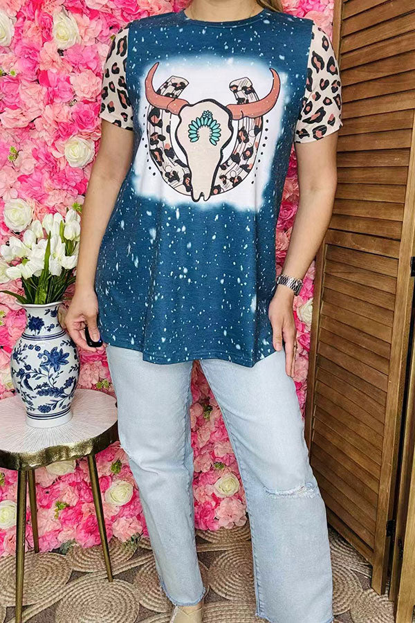 Top features with bull skull & leopard printed with blue background with short sleeves.