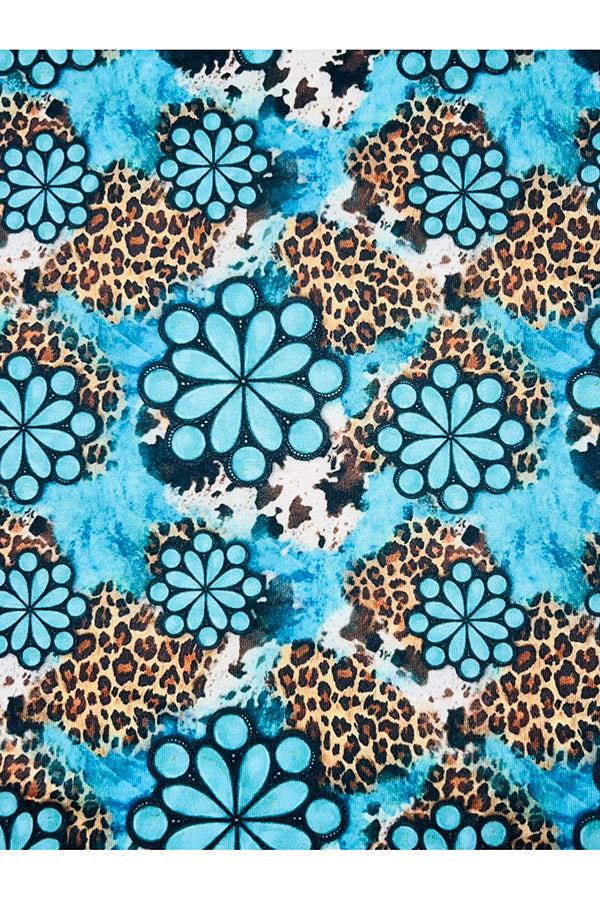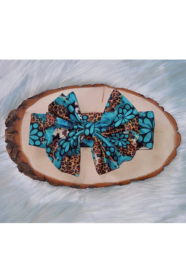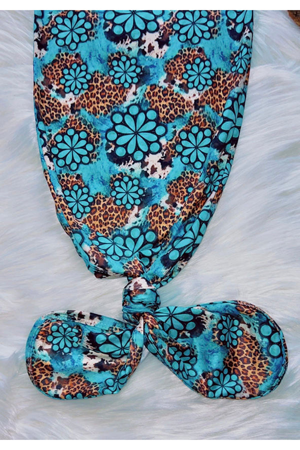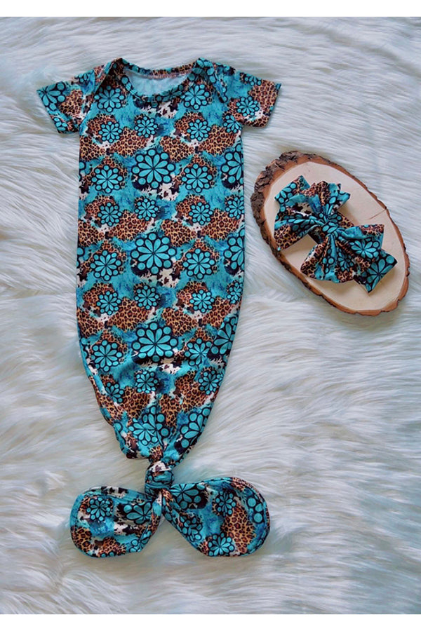 - Both baby gown and matching headband features trendy turquoise stones creating flower shapes with small leopard print all over.