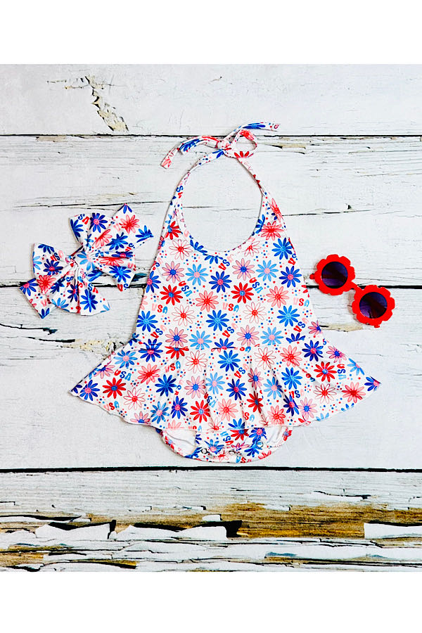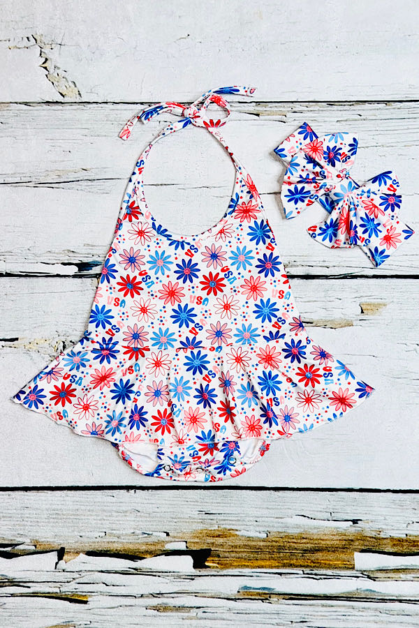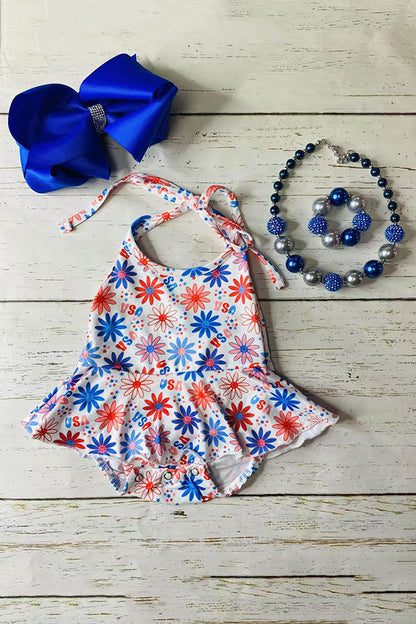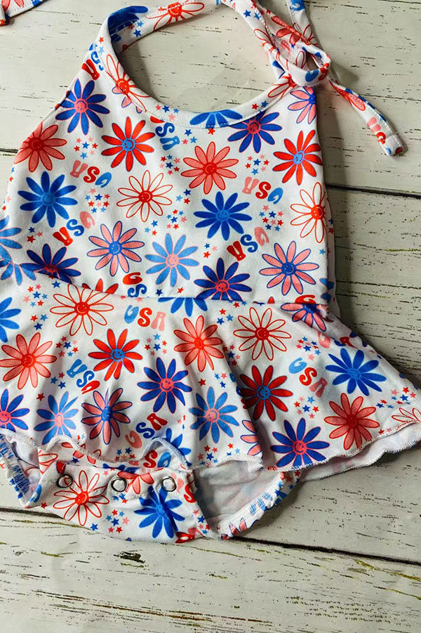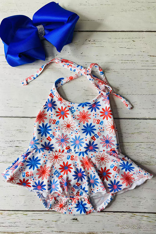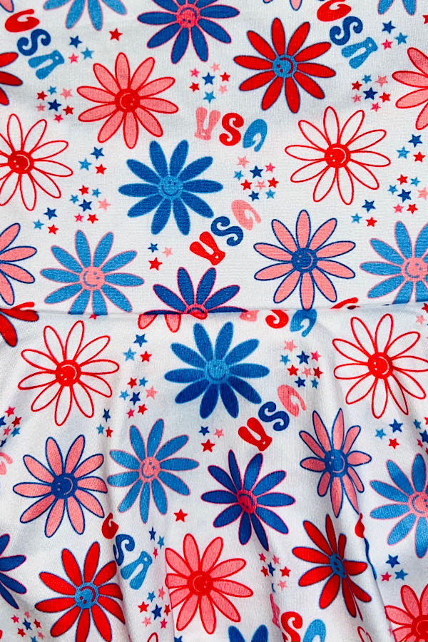 Romper features "USA" wording with red & blue smiley flower faces & stars on a white background.