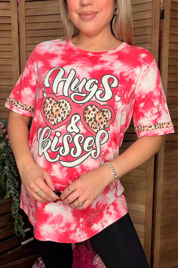 Top features in "Hugs & Kissed" & leopard hearts printed on tie dye pink background w/short sleeve.