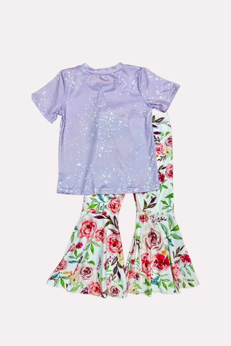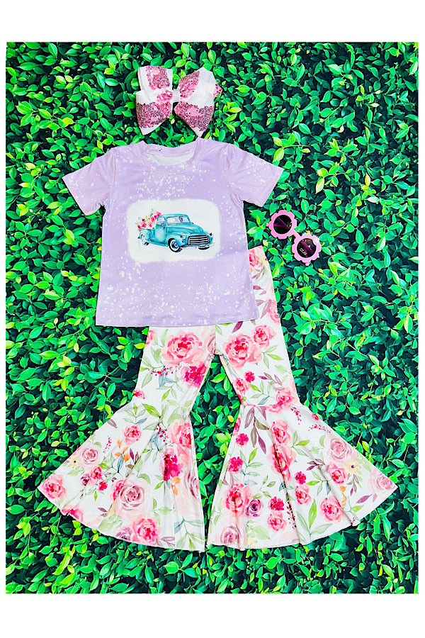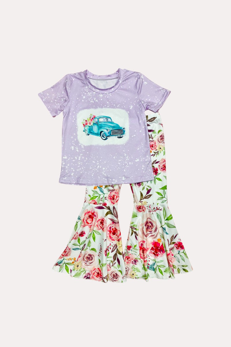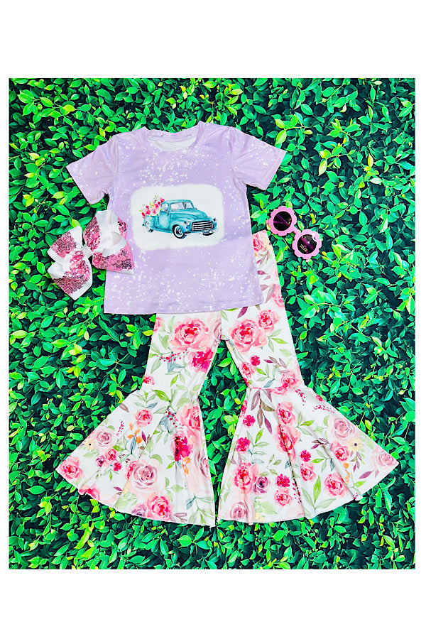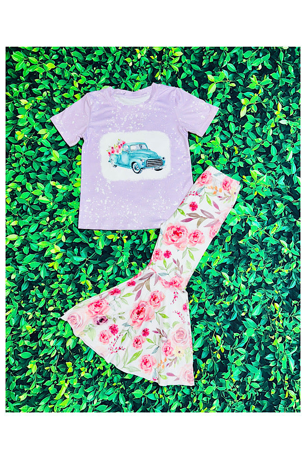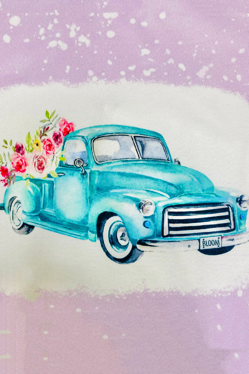 - Top features a light blue vintage truck on bleached light purple background & sleeve cut.