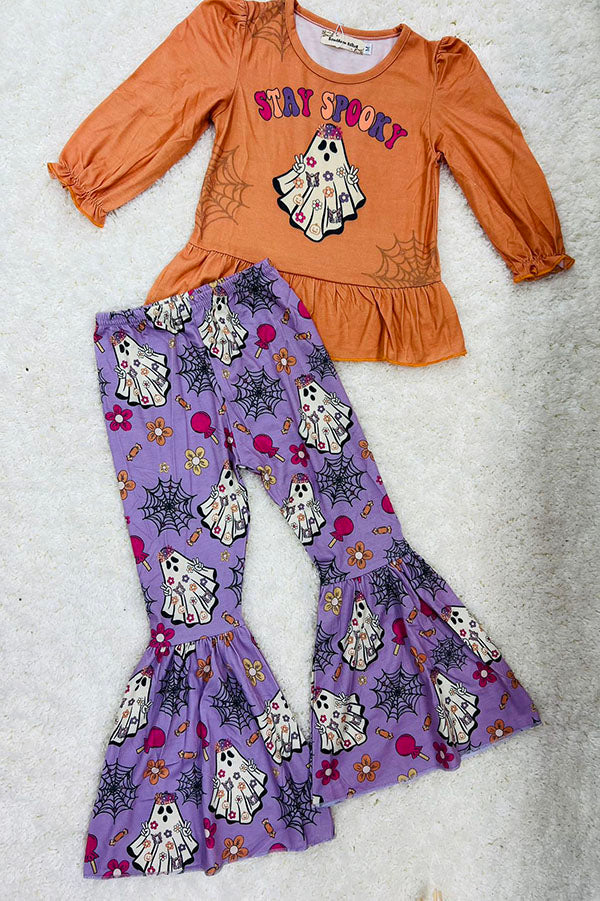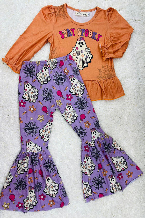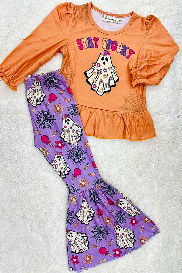 - Top features "STAY SPOOKY" wording w/a cute ghost print on solid washed orange background w/ruffles & long sleeve cut.