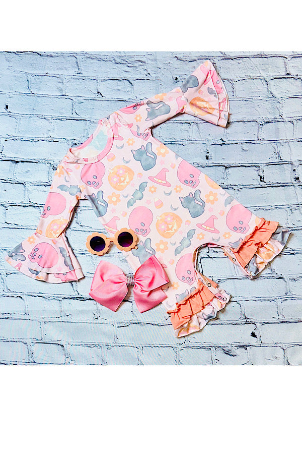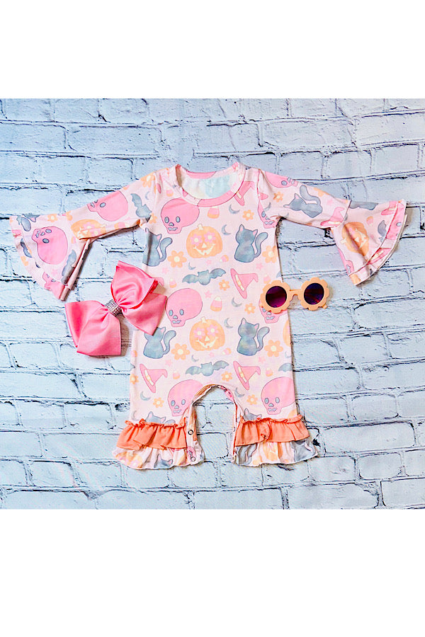 - Romper features washed multi-Halloween prints on baby pink background & peach color ruffles & long sleeve cut.