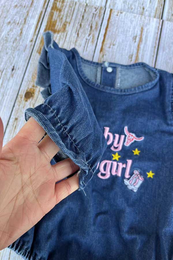 Romper features Baby Cowgirl embroidery on denim blue fabric with ruffle long sleeves & snap buttons.