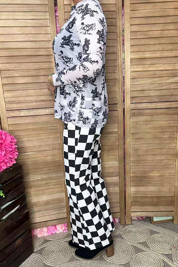 Western cowboy printed mesh long sleeve sheer women top XCH16964