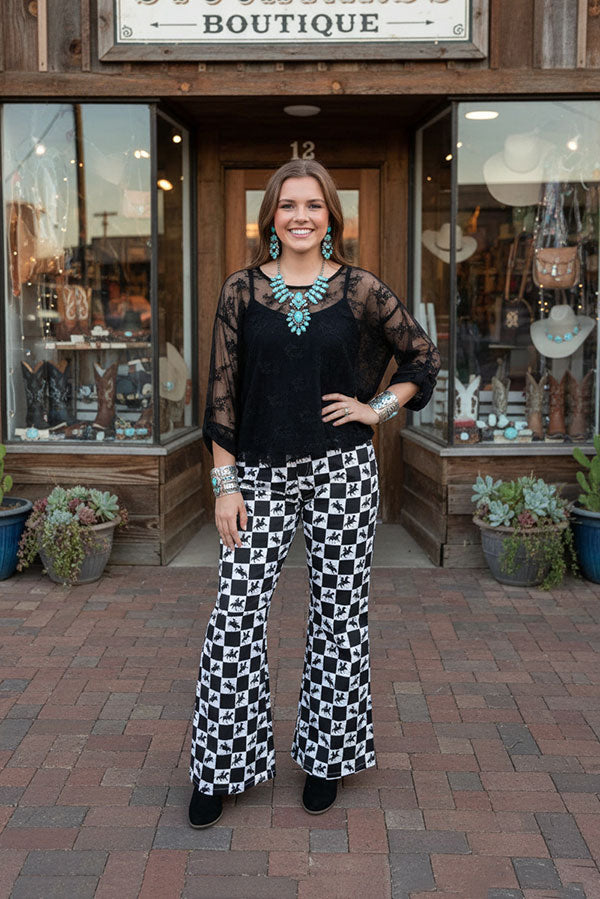 Pant features with checkckered & western horse riding patterns & inside zipper & pockets & flare legs