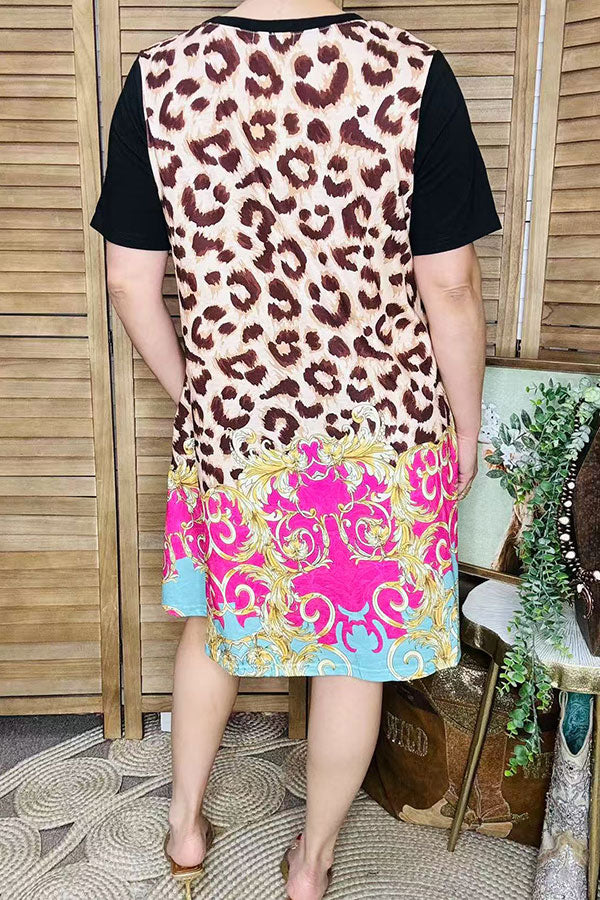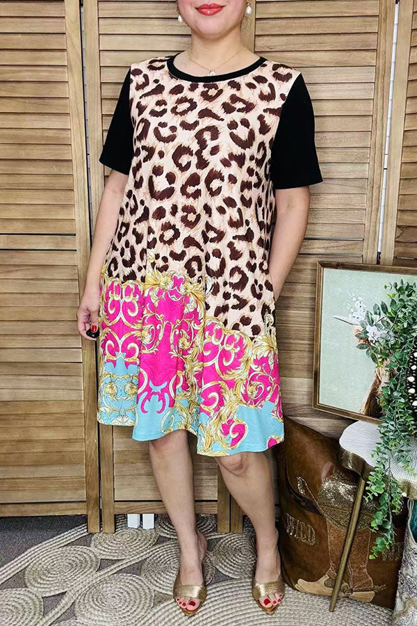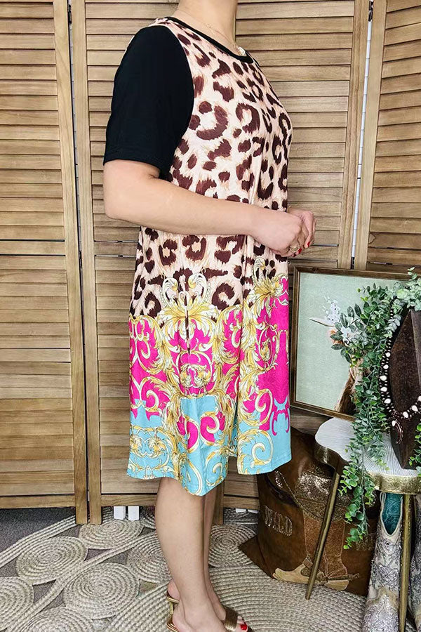Dress features with leopard & multi color paisley printed with black shrot sleeves & side pockets.
