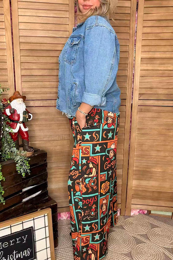 Pant features with western patterns printed & wide leg & high waist band with pockets.