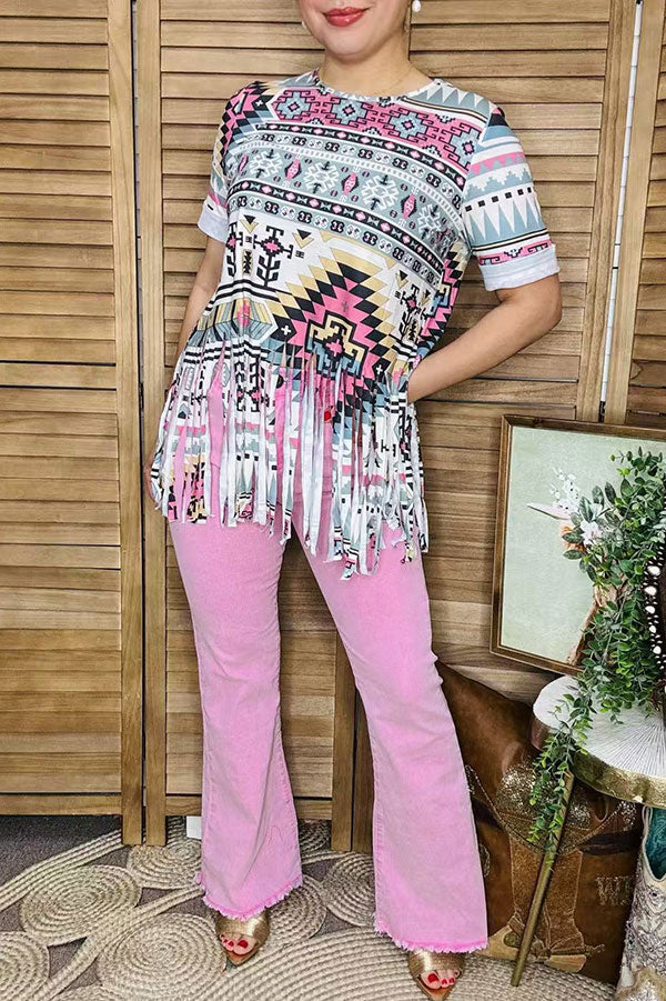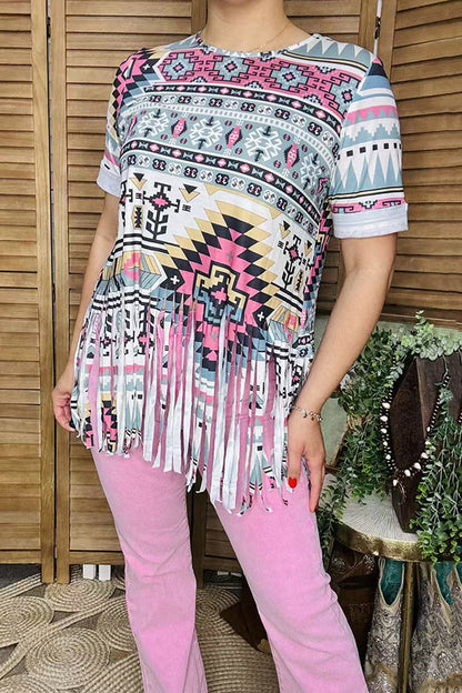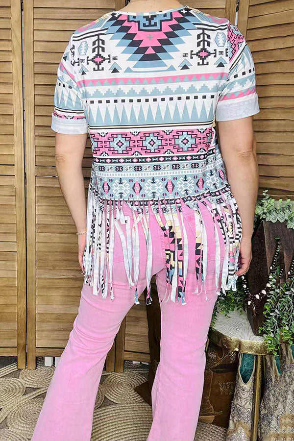Top features Aztec mix color printed/long tassels trim with short sleeves