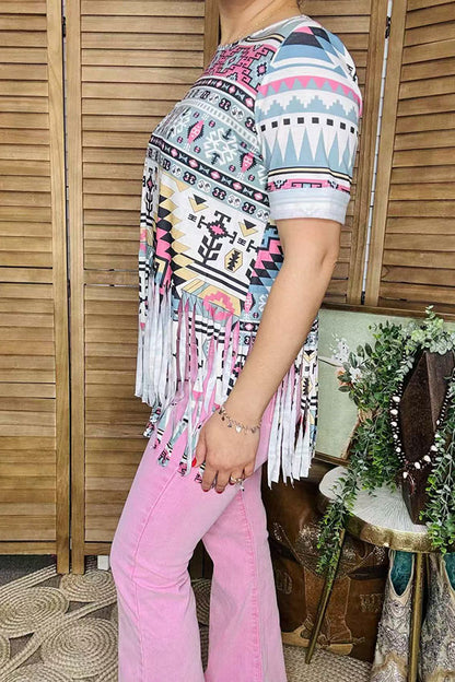 Western women top wholesale Aztec printed fringe & short sleeves GJQ14187