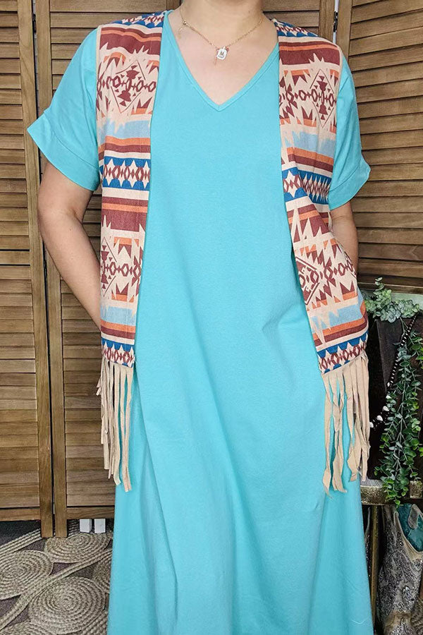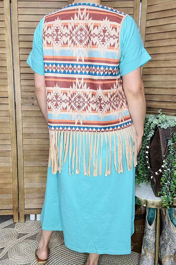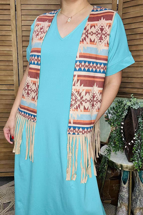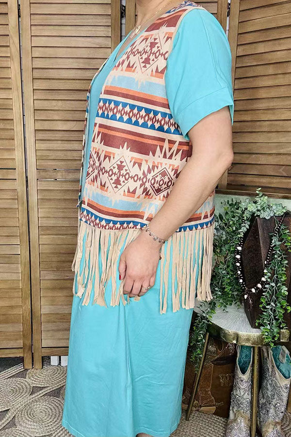 Vest features with multi color aztec printed suede fabric with fringes & sleeveless.