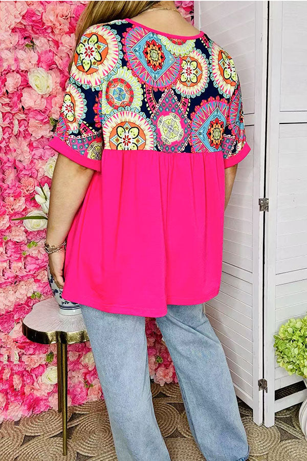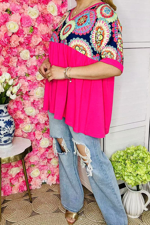 Tops features with western floral & paisley printed & fuchsia color block w/short sleeves and v-neckline.