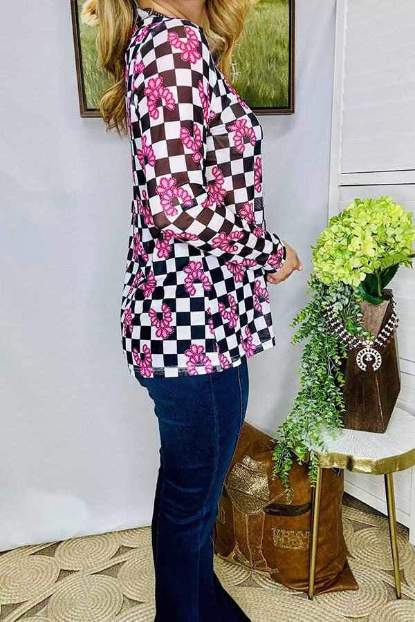 Top features with pink jewels & checkered with long sleeves & sheer mesh fabric & wholesale price.