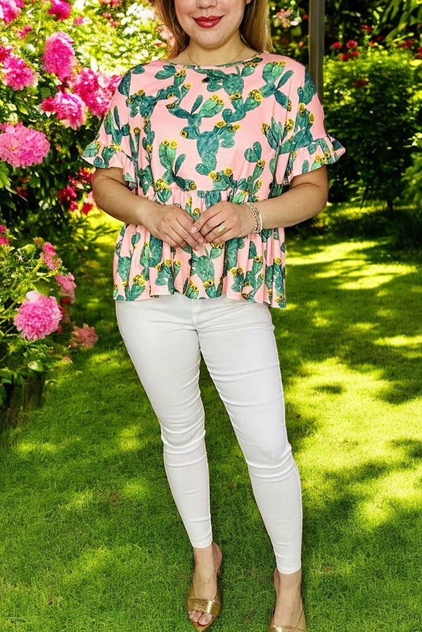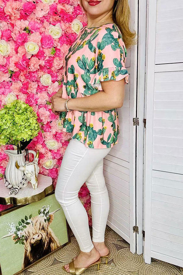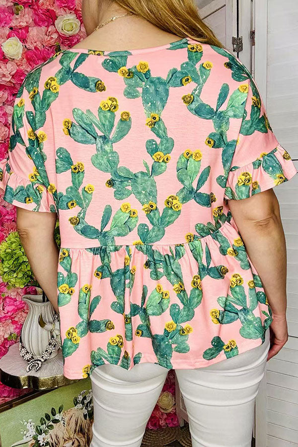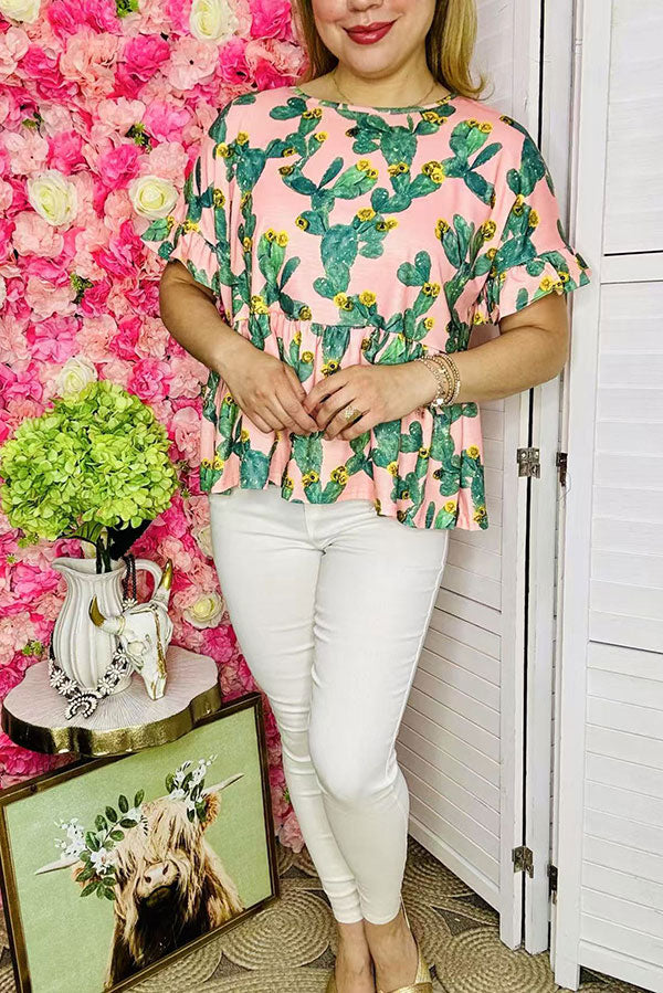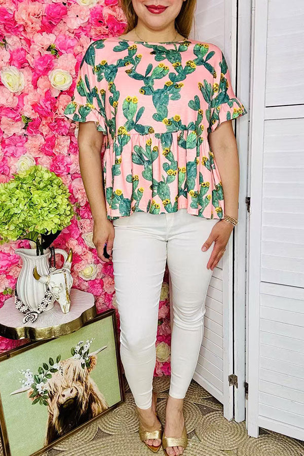 Top features with cactus prints on pink bacground with short sleeves & short style.