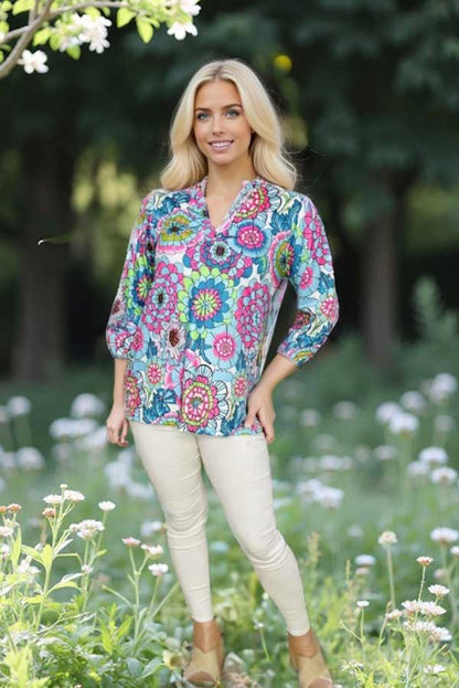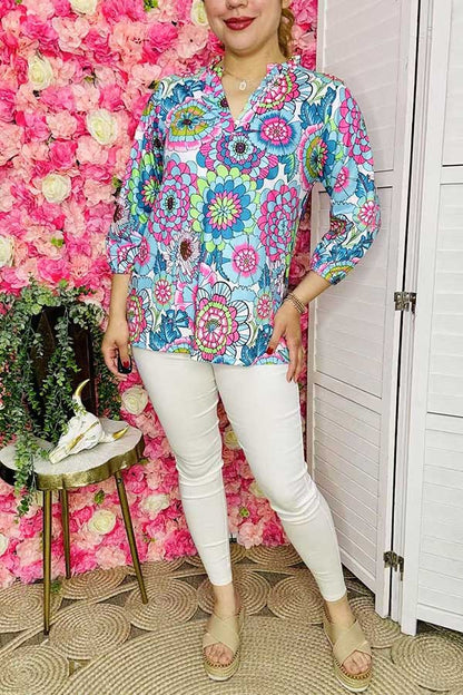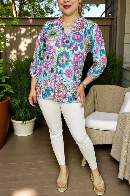 Top features multi color floral prints on white background with 3/4 sleeves & V-neckline.