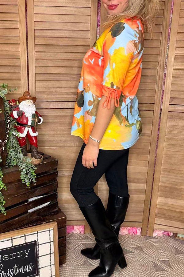 Top features pink & yellow & dark green patterns printed on blue background with hafl sleeves & tied bow , v-neckline with orange lace trim around collar.