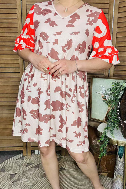 Dress features with leopard printed on tan background with red leopard printed bell short sleeves & side pockets.