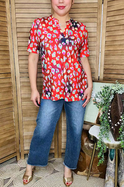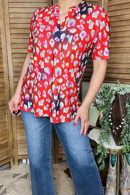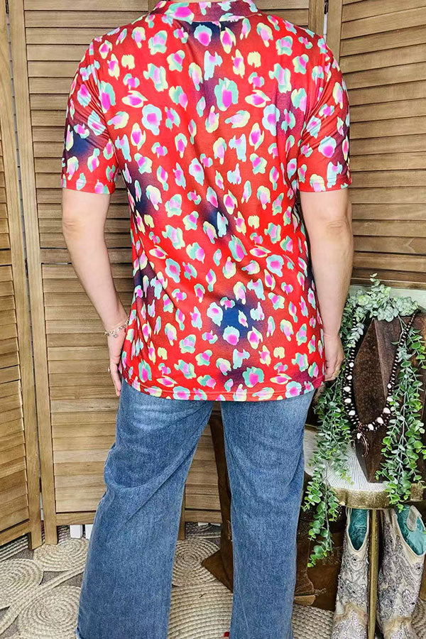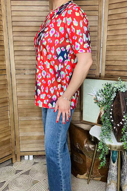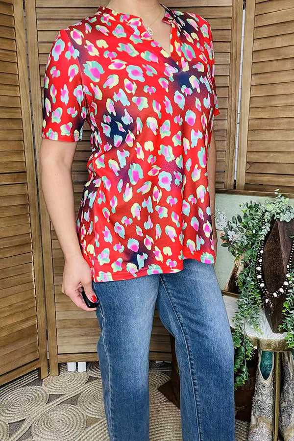 Top features with multi color leopard printed with short sleeves and v-neckline.