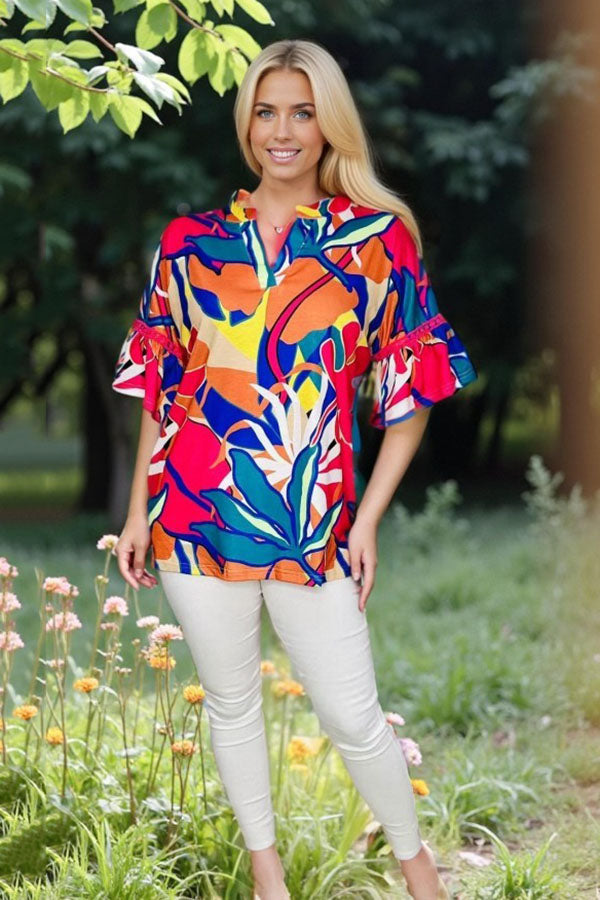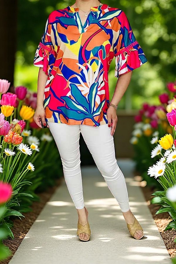 Top features multi color floral prints with ruffle short sleeves and hot pink lace trim & V-neckline.