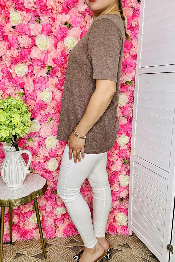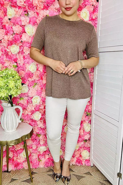 Women's boutique clothing wholesale solid color light tan short sleeve tops GJQ15568