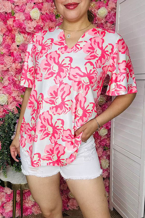 Top features pink flower prints & bell short sleeves & v-neckline.