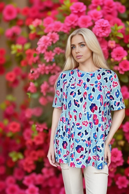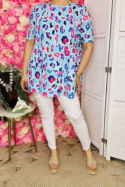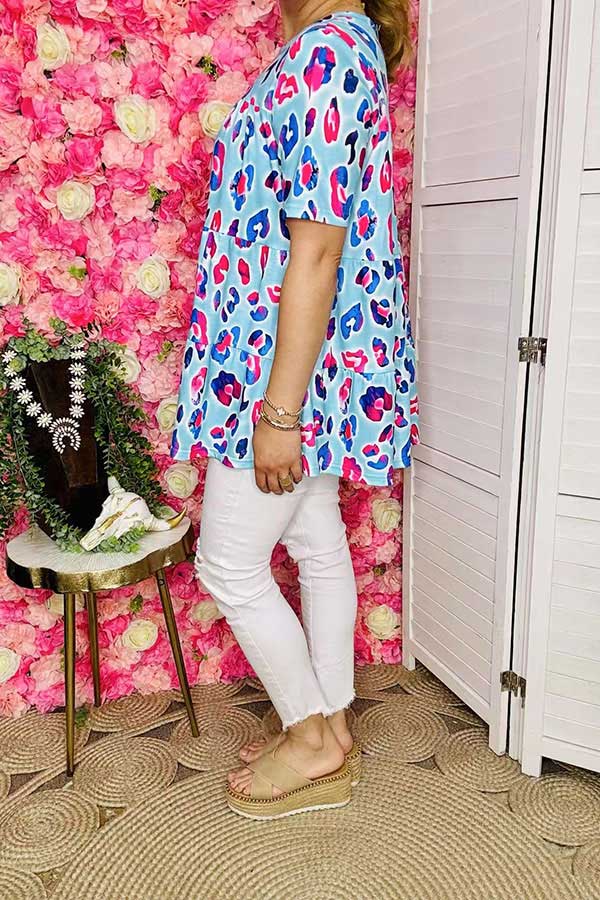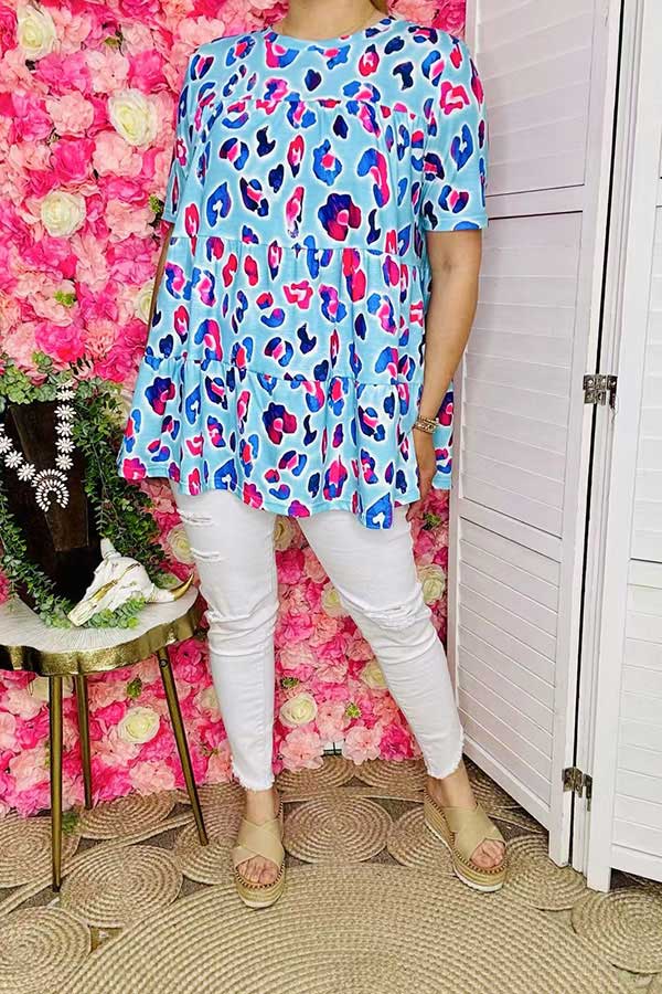 Top features pink and blue leopard prints on baby blue background with short sleeves.
