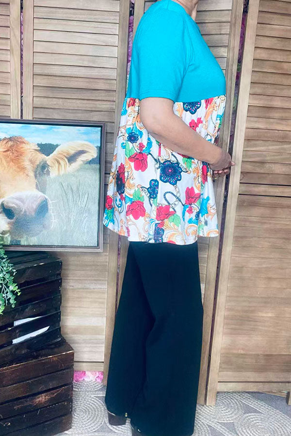 Top features with turquoise & floral prints color block w/ short sleeves and baby doll cut.