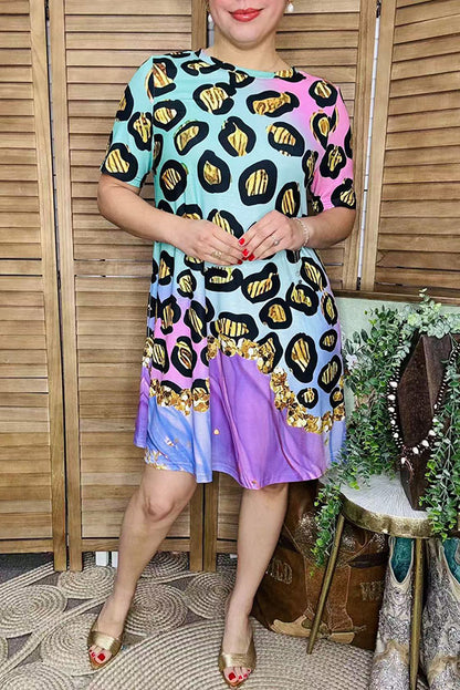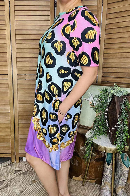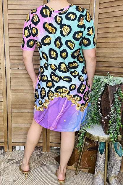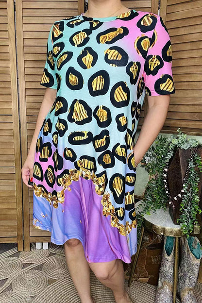 Dress features with golden leopard on color blend backgorund with short sleeves and pockets for women's boutique clothing wholesale.
