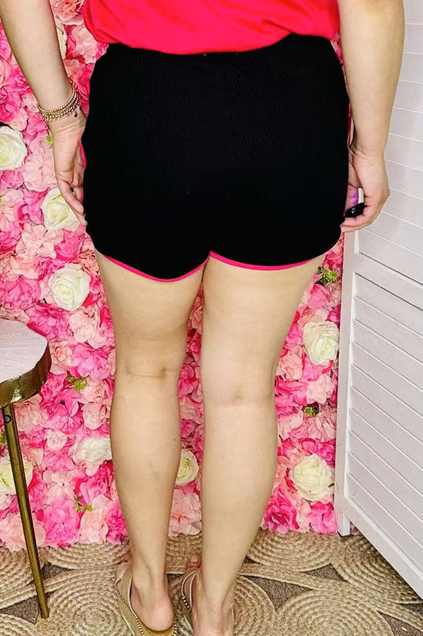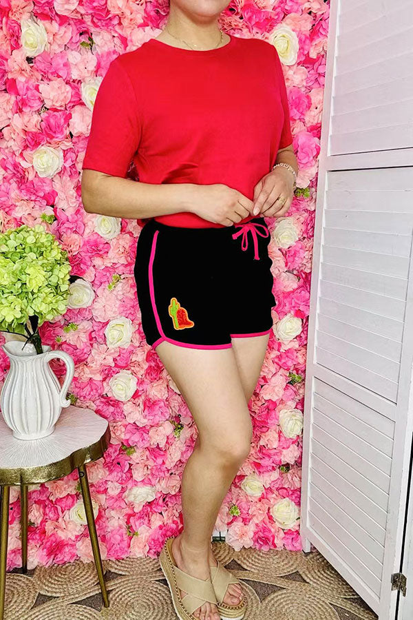 Shorts features with cactus & boots embroidery & solid color black pit cotton with pink trim & adjustable wasit band.