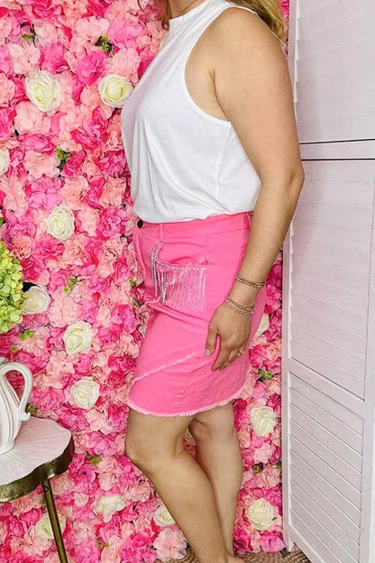 Skirts features with solid color pink denim fabric with rhinestore tassels & pockets. & zipper inside.