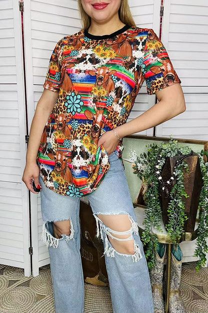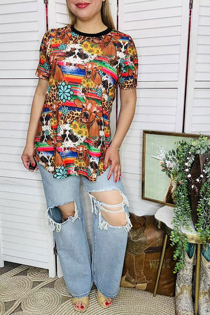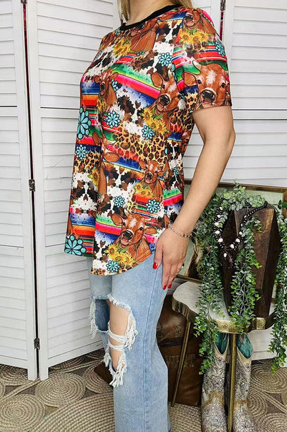 Top features with serape & cow & jewels prints with short sleeves.